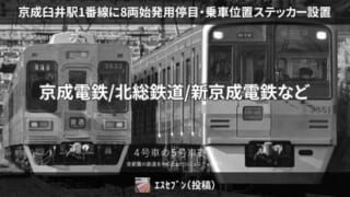15日、京成臼井駅1番線に8両始発列車用の停目と乗車位置ステッカーが設置されたことが確認されています。同駅からの定期始発列車は現在6両のみが設定されているため、今後の動向に注目されます。京成臼井1番線にて。乗車位置ステッカーが貼り変わってる