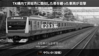 本日25日、東京総合車両センター(TK)構内にて、現在房総エリアで運用されているE131系に酷似した帯を纏っている車両が確認されています。今年度の東京総合車両センターでは、E233系の千葉エリア転用改造が計4編成(内訳:0番台2編成・100