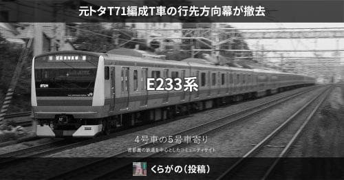 E233系元トタT71編成のT車(サハE233-43と推測)ですが、本日までに行先方向幕の撤去が確認されています。廃車される車両は、銘板の撤去や2休車札が確認された例がありますが、留置位置から確認できない状況となっています。2025.12.
